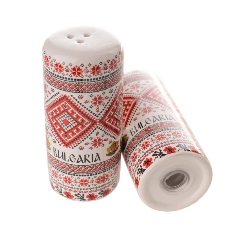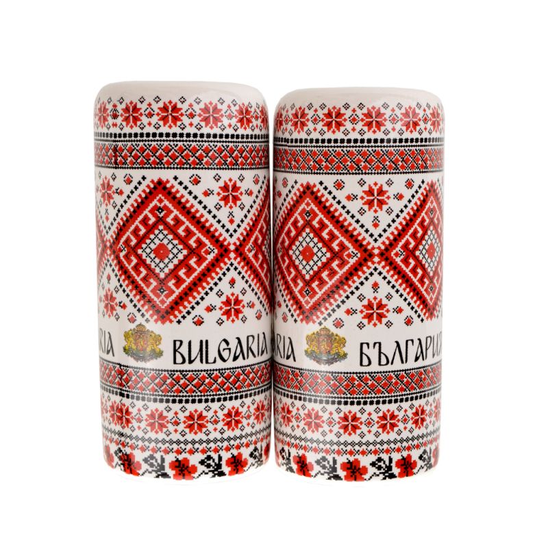 Комплект два броя сувенирни солници, декорирани с традиционни български шевици.