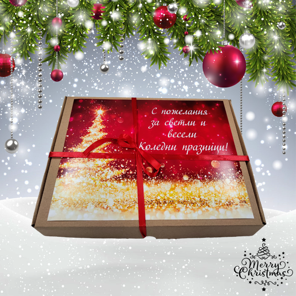 Комплектът е опакован в тематична коледна подаръчна кутия с панделка.