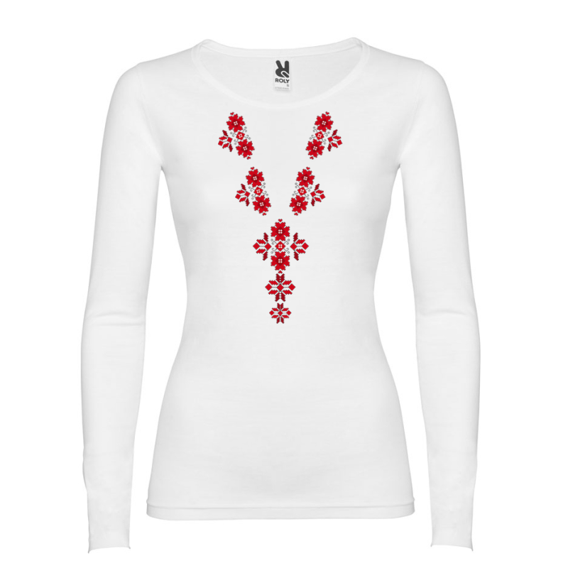 Бяла блуза с народни мотиви. Материя: трико 100% памук.