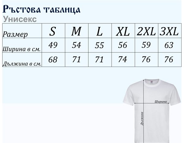 Моля сравнете размера на ваша тениска с размерите от таблицата.