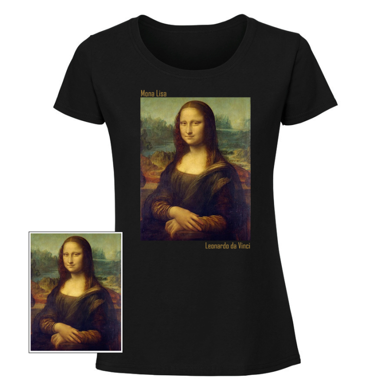 Дамска черна тениска с отпечатана картина - Мона Лиза на Леонардо да Винчи.