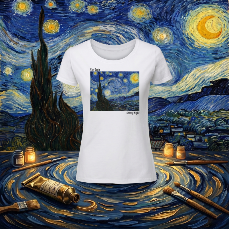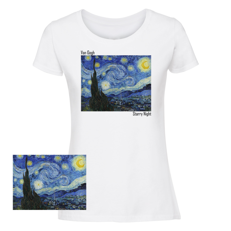 Дамска бяла тениска с отпечатана картина - Звездна нощ на Ван Гог