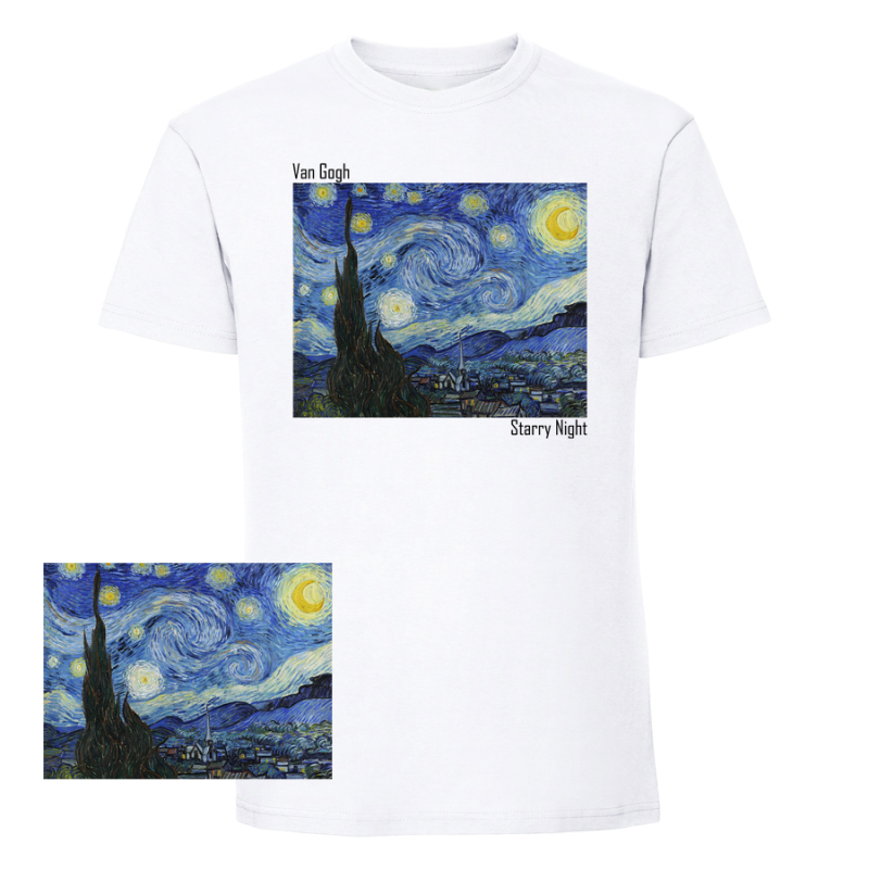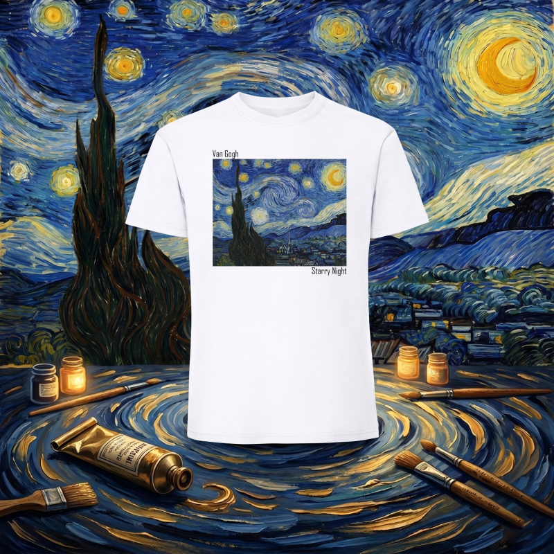 Как да поддържам тениската, за да запазя принта? Препоръчваме пране на 30°C с опаковката навън и избягване на сушилня, за да съхраните цветовете на Ван Гог максимално дълго.