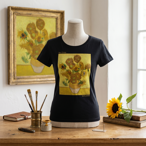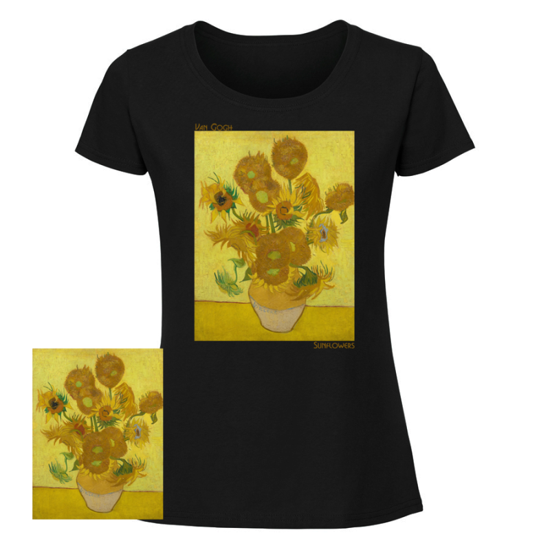 Дамска черна тениска с отпечатана картина - Слънчогледи на Ван Гог